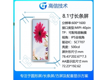 | 关键描述: | 8.1寸长条显示屏 600*1600 500亮度 40PINS MIPI 全视角 高亮显示屏 |