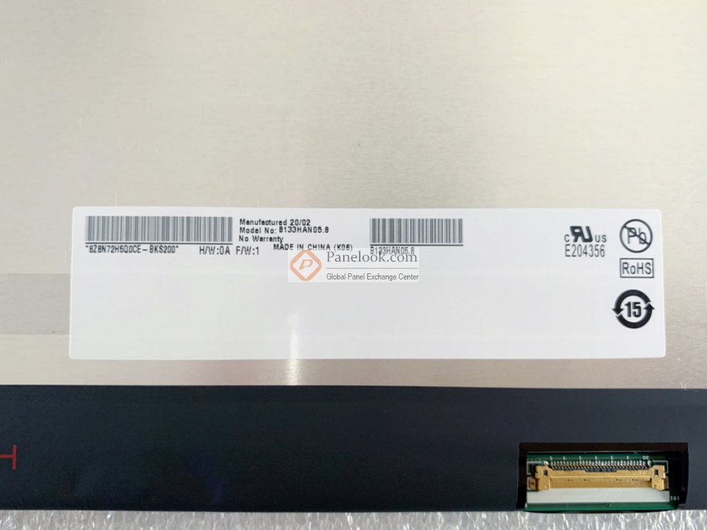 B133HAN05.8 (产品代码: AUO582D)是友达光电股份有限公司 (友达,AUO) 推出的一款采用LTPS TFT-LCD技术的13.3英寸液晶模组产品,它装配有WLED背光,含LED驱动背光驱动,无触摸。根据友达 (AUO)于2018年1月22日发布的版本号为HW0A_Ver0.1的产品规格书,B133HAN05.8显示分辨率为1920(RGB)×1080 (FHD),宽高比为16:9 (宽:高),像素采用RGB垂直条状排列。它的显示区域尺寸为293.76×165.24 (宽×高) mm,外观尺寸为298.96×184.9 (宽×高)×2.8(厚) mm,表面处理为雾面,产品净重350g (Max.)外观样式为薄屏 (PCBA平直, 厚度≤3.2mm)。背光方面此产品采用了WLED发光的侧入式光源,光源的使用寿命为15K小时,含LED驱动。B133HAN05.8采用了eDP (2 Lanes)信号接口,总共30 pins,采用端子连接,驱屏电压为3.3V (Typ.)。它的典型垂直刷新率Fv为60Hz。如果开发新产品想采用B133HAN05.8液晶模组,屏库®建议您向友达 (AUO)或其代理商了解关于B133HAN05.8的最新的生产状态信息和技术信息。屏库®上所显示的面板参数均由屏库电子工程师依据规格书录入,已尽力减少错误,但不能保证参数的完全正确。请以规格书为准!根据屏库掌握的情报此产品于2018年Q2量产,当前生产状态为已停产。目前B133HAN05.8在屏库上有0条现货信息、0家供应商信息,交易氛围清淡。屏库于2020年03月31日对此型号首次建立参数,并于2025年04月14日对参数进行了最后更新。它的工作温度为 0 ~ 50°C,存储温度为 -20 ~ 60°C,耐振动性为1.5G (14.7 m/s²)。基于它sRGB,白光LED背光,含LED驱动器,端子倒装,表面雾面, eDP1.3等特征,此型号推荐使用于笔记本。