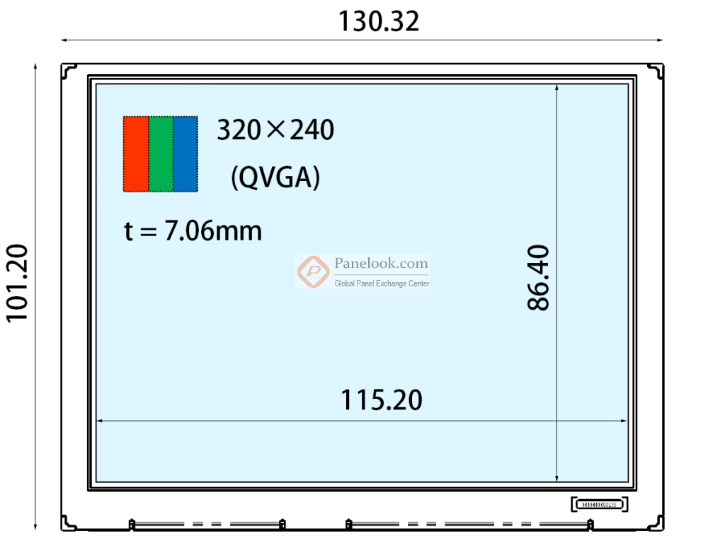 显示区域 115.2(W)×86.4(H) mm 外观尺寸 130.32(W)×101.2(H)×7.36(D) mm