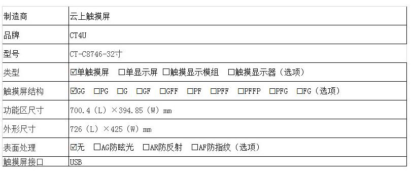 | 关键描述: | 32寸电容触摸屏多媒体广告查询一体机显示触控屏usb接口g+g结构 |