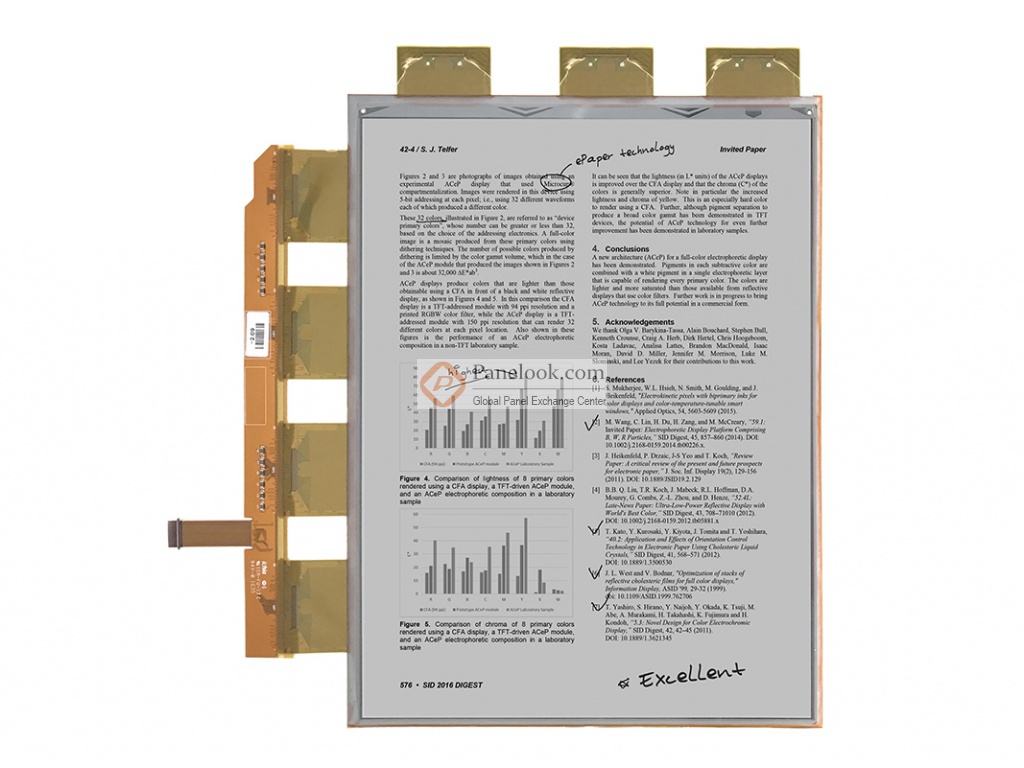 元太 (E Ink) 推出的ES133TT3是一款采用EPD技术的13.3英寸电子纸产品,它无背光,无触摸。屏库总结它的典型特征为: 柔性显示,反射式,表面雾面, Carta 1.2 E Ink Film, Flexible Backplane, 16 greyscale。它的工作温度为 0 ~ 50°C,存储温度为 -25 ~ 70°C。此型号适合应用于电子书。根据屏库掌握的情报此产品于2017年Q1量产,当前生产状态为已停产。目前ES133TT3在屏库上有1条现货信息、0家供应商信息,交易氛围清淡。屏库于2017年09月20日对此型号首次建立参数,并于2023年10月18日对参数进行了最后更新。根据元太 (E Ink)于2016年10月11日发布的版本号为Ver2.0的产品规格书,ES133TT3显示分辨率为2200×1650,宽高比为4:3 (宽:高),像素采用矩形排列,屏库计算出的像素密度为206 PPI。它的显示区域尺寸为270.6×202.95 (宽×高) mm,外观尺寸为287(宽)×215.5(高)×0.71(厚) mm,表面处理为雾面,产品净重68.0±7.0g。本产品无背光。ES133TT3采用了Parallel Data (2ch, 8-bit)信号接口,总共39 pins,采用FPC连接,驱屏电压为3.3V (Typ.)。它的典型垂直刷新率Fv为75Hz。如果开发新产品想采用ES133TT3电子纸,屏库®建议您向元太 (E Ink)或其代理商了解关于ES133TT3的最新的生产状态信息和技术信息。屏库®上所显示的面板参数均由屏库电子工程师依据规格书录入,已尽力减少错误,但不能保证参数的完全正确。请以规格书为准!
