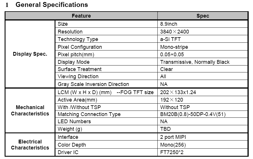 | 关键描述: | 8.9寸黑白液晶玻璃, 3840*2400, 50pins, MIPI接口, FT7250, 适用于3D打印行业 |