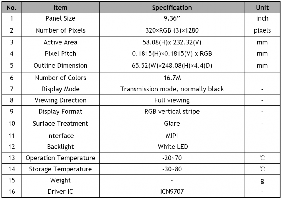 | 显示尺寸: | 58.08 (宽) × 232 (高) mm (A.A) |
