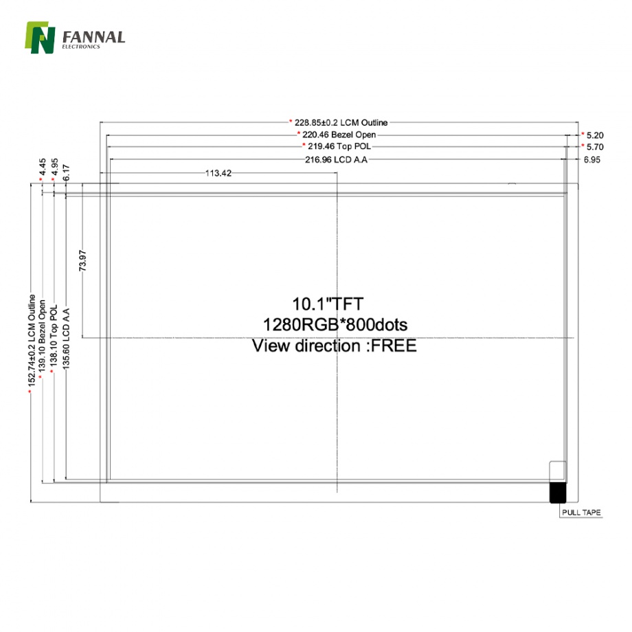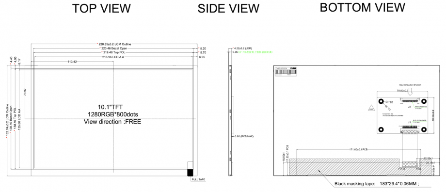| 10.1 | 1280x800 | 1000 | LVDS 40 | 229.46x149.1x4.75 | 216.96x135.6 | 50K | -20~70 | 85/85/85/85 | FN1010D025A |