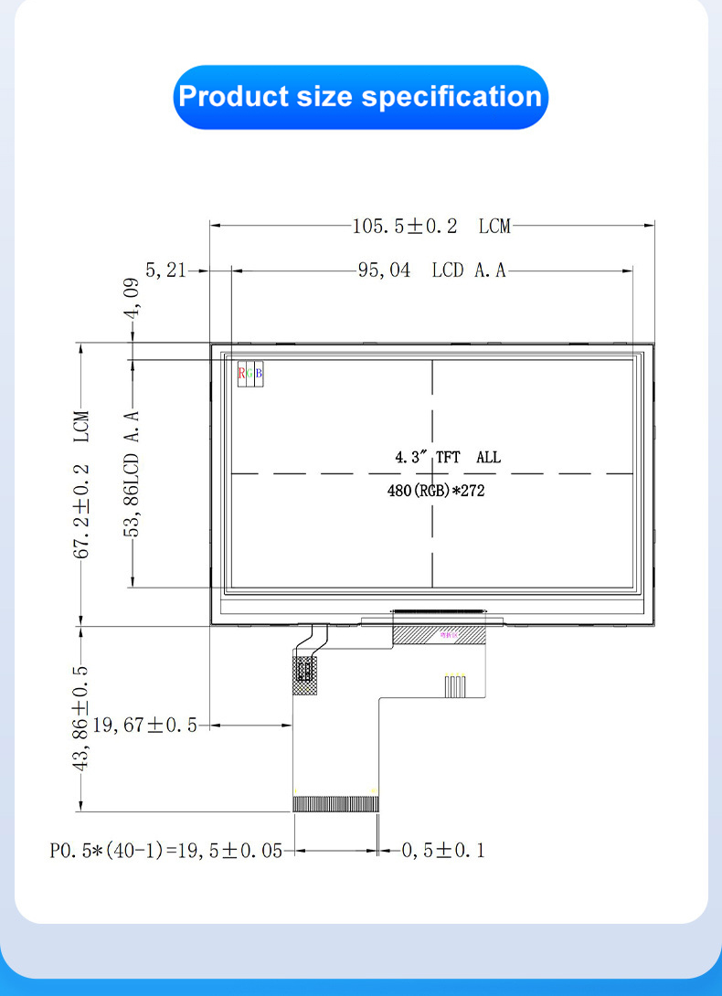| 关键描述: | 4.3寸高亮液晶屏 1300亮度 480×272分辨率 40pin RGB接口 4.3寸TFT-LCD |