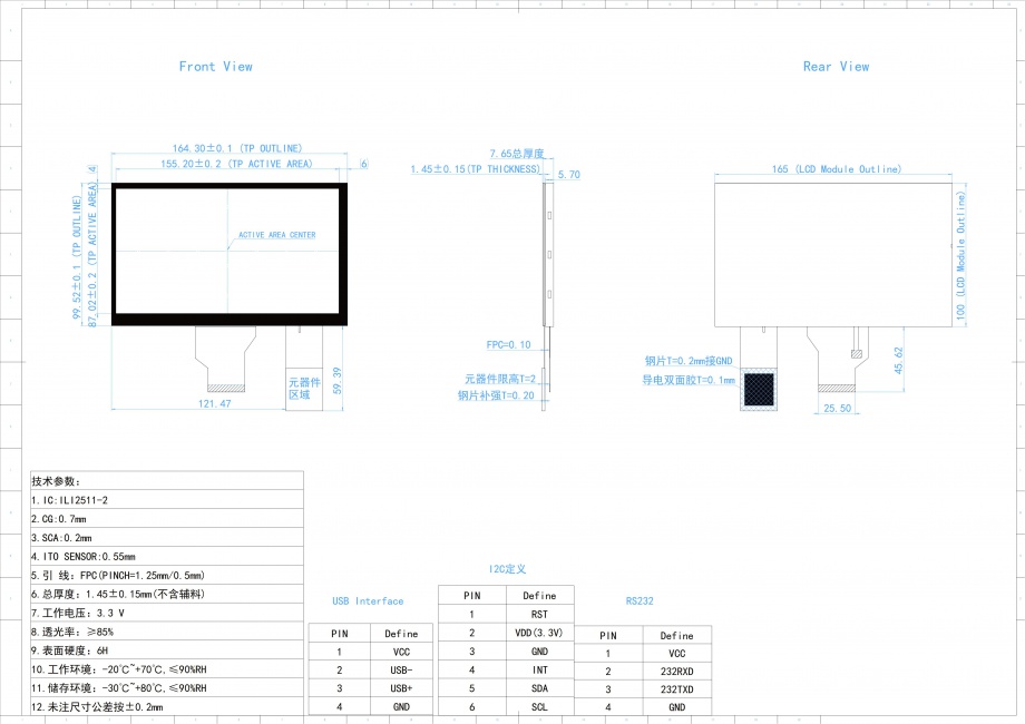 The specification GT070TN94-R45-T03 is a 7 ”(800x480) TFT Liquid Crystal Display module composed of a TFT LCD panel, P-Cap Touch Panel and LED Backlight unit , 50 pin TTL interface, normally White transmissive display mode.