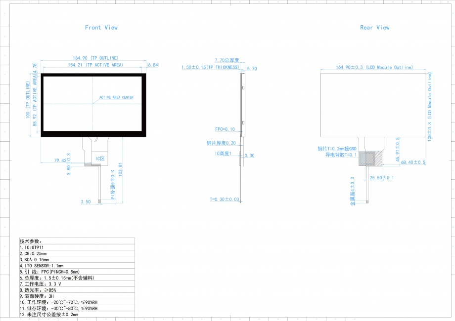 The specification GT070TN94-R45-T04 is a 7 ”(800x480) TFT Liquid Crystal Display module composed of a TFT LCD panel, P-Cap Touch Panel and LED Backlight unit , 50 pin TTL interface, normally White transmissive display mode.