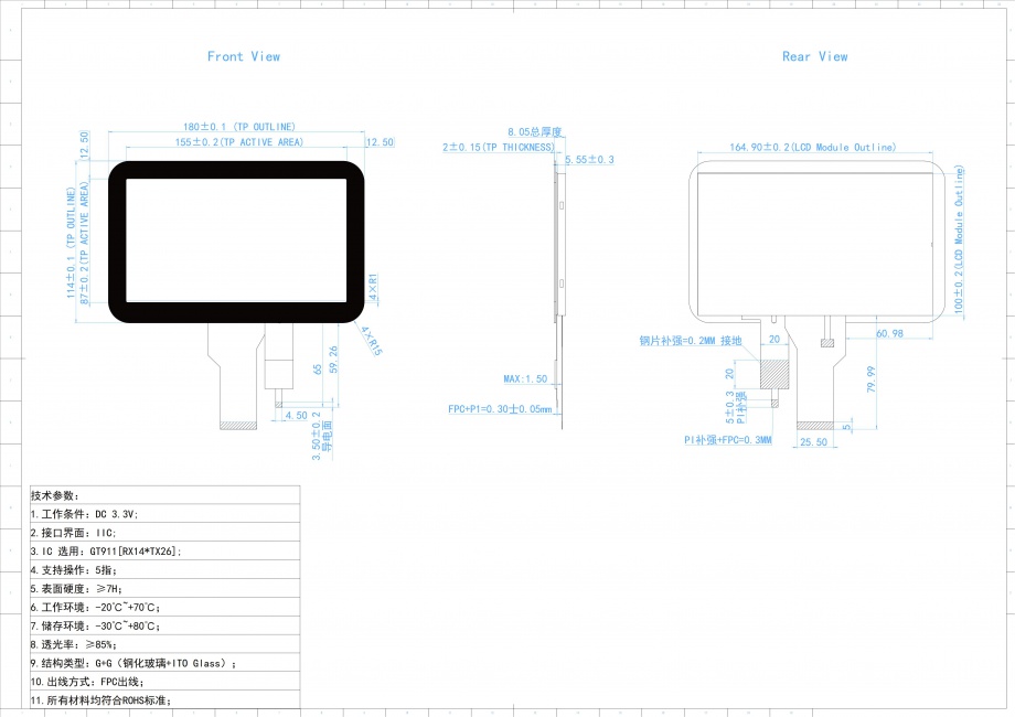The specification GT070TN94-R80-T42 is a 7 ”(800x480) TFT Liquid Crystal Display module composed a TFT LCD panel, P-Cap Touch Panel and LED Backlight system, , 50 pin TTL interface, normally white transmissive display mode.