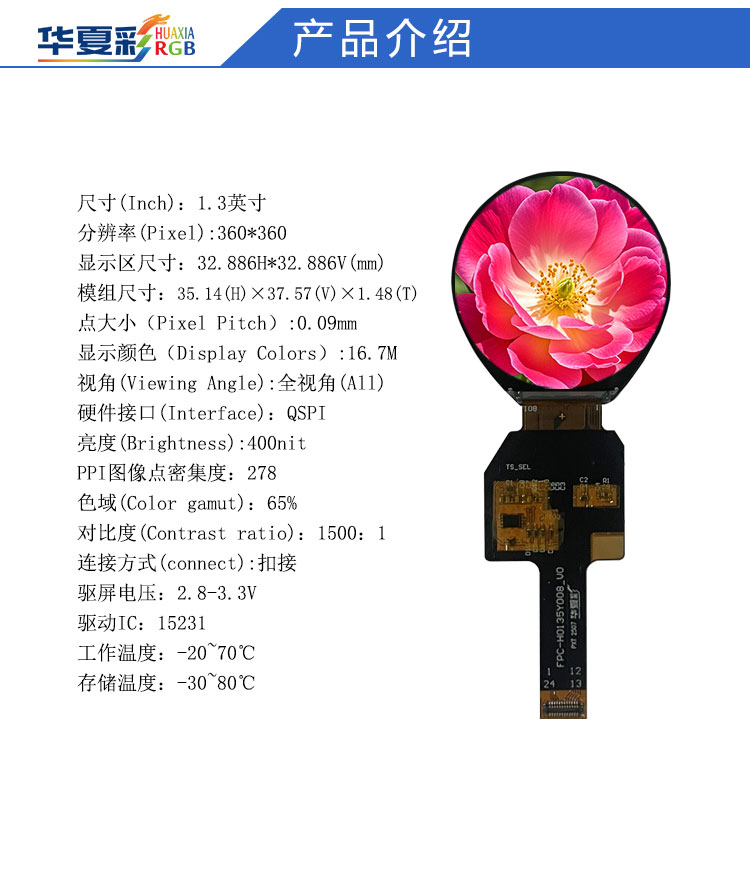 | 关键描述: | 1.3寸360*360高清全圆显示屏QSPI接口incell触摸极小黑边毛绒玩具眼睛彩屏 |