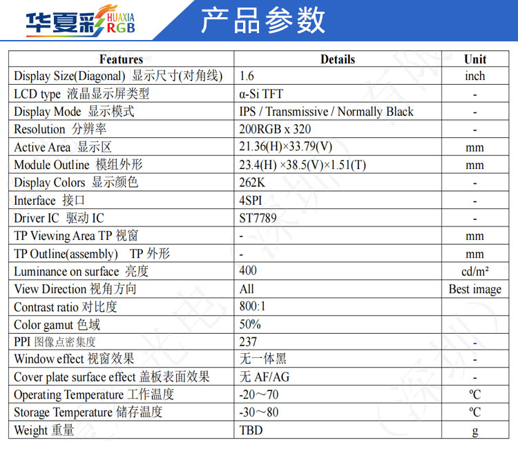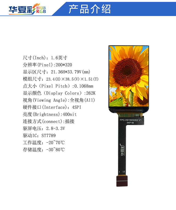 | 关键描述: | 1.6寸200X320小长条显示屏4SPI接口全视角LCD小尺寸液晶彩屏厂家 |