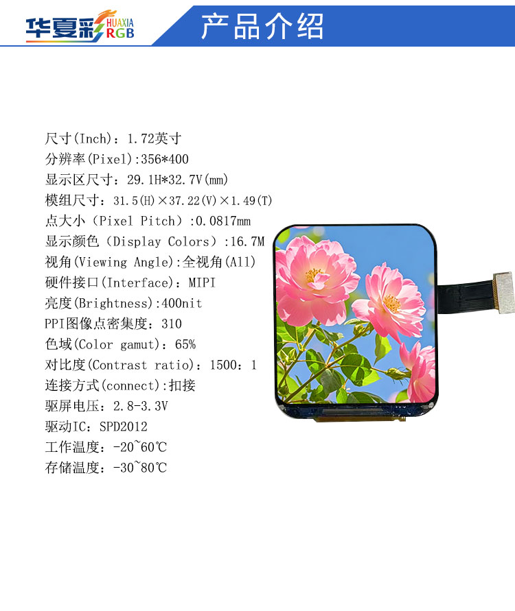 | 关键描述: | 1.72寸356*400高清incell集成触摸MIPI接口显示屏高性价比液晶屏 |