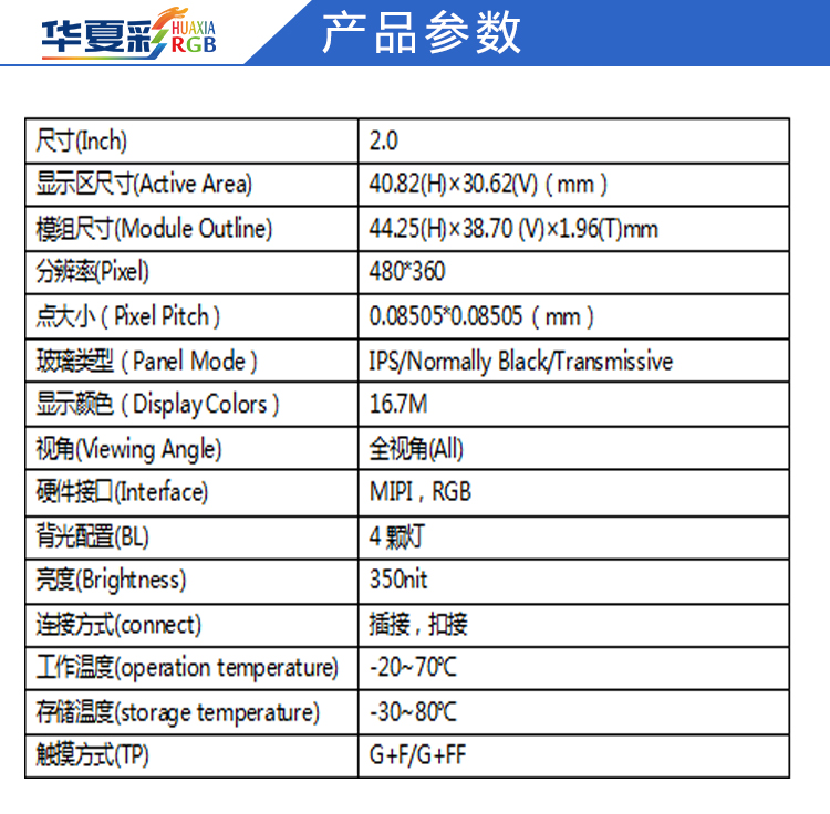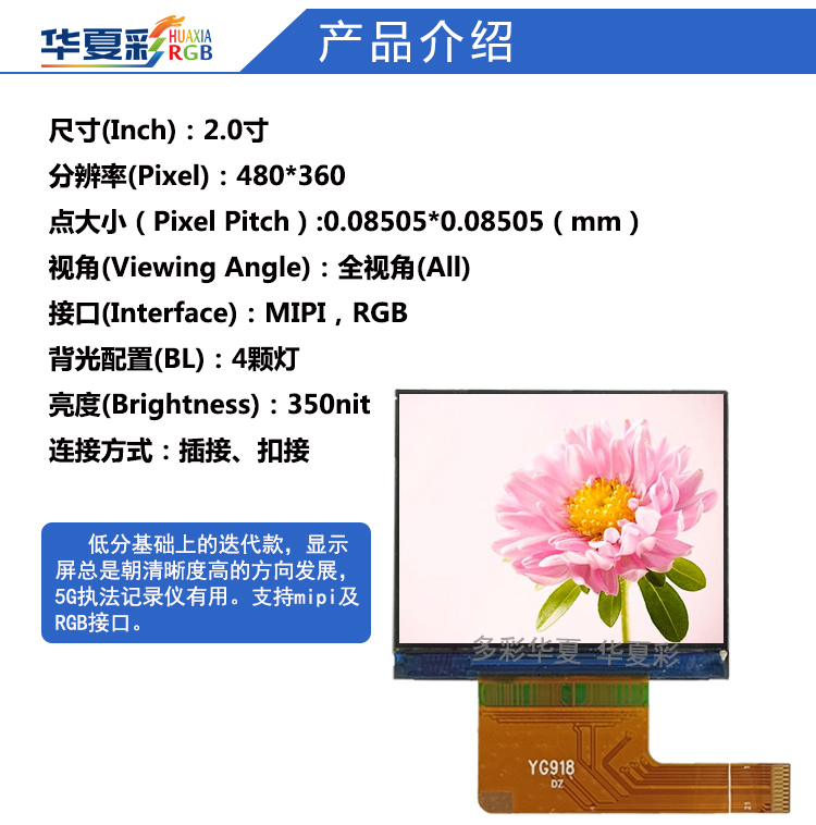 | 关键描述: | 2.0寸横屏480*360高清显示屏对讲机执法记录仪汽车检测仪胎监仪器MIPI RGB接口 |