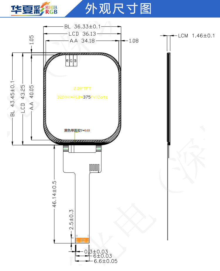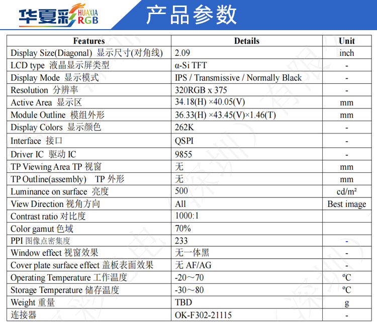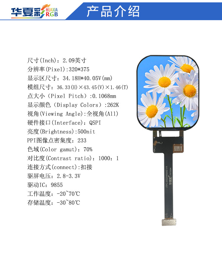 | 关键描述: | 2.09寸320*375高清R角方屏QSPI、MIPI接口窄边框儿童照相机显示屏 |