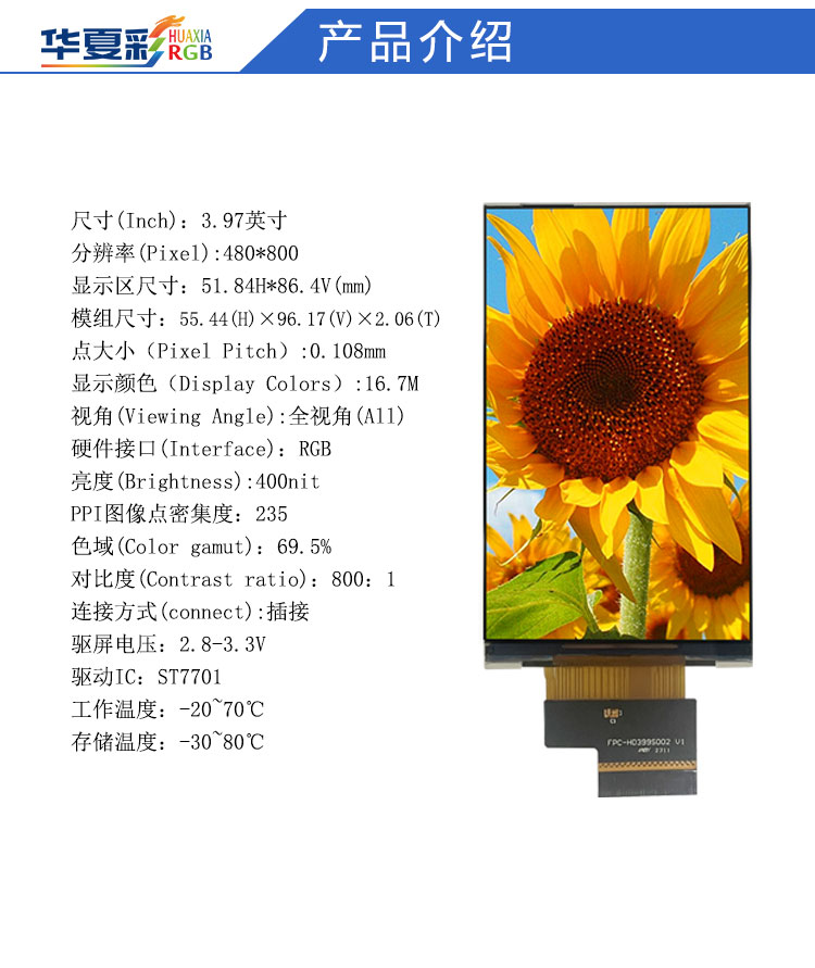 | 关键描述: | 3.97寸480*800显示屏拍拍宝高性价比RGB全视角户外检测设备彩屏 |