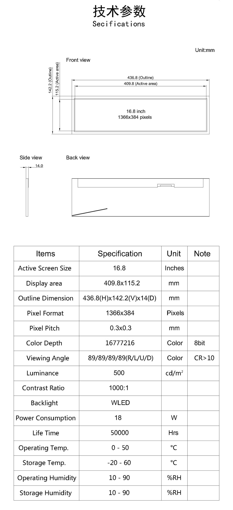 | 关键描述: | 18.5寸1/2切割高亮条形液晶屏 切割屏 条形屏 1366*384, 500nit, LVDS |