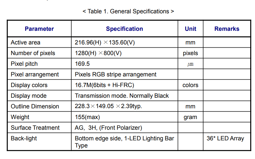 | 显示尺寸: | 216.96 (宽) × 135.6 (高) mm (A.A) |