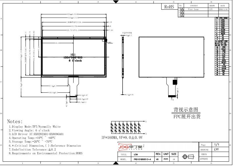 10.1寸, 像素:1024*600 Pixels , 200亮度, TTL接口, TN液晶模组