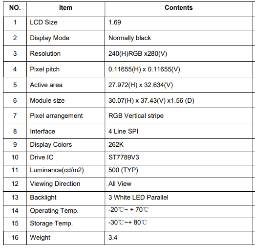 | 关键描述: | 1.69寸TFT液晶显示屏 240*280 IPS液晶屏 500亮度 12PINS SPI ST7789V3 |