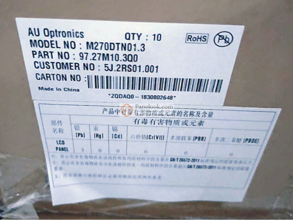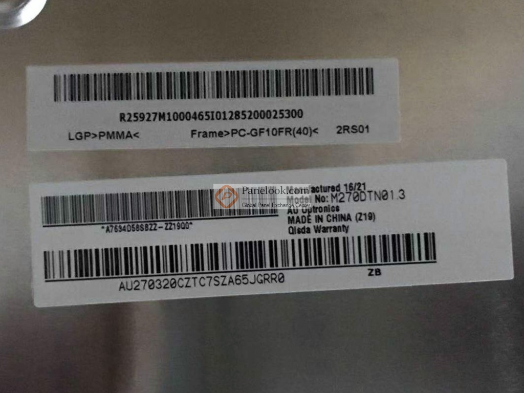 M270DTN01.3是友达光电股份有限公司 (友达,AUO) 推出的一款采用a-Si TFT-LCD技术的27.0英寸液晶模组产品,它装配有WLED背光,无背光驱动,无触摸。根据友达 (AUO)于2015年9月3日发布的版本号为Ver.D03的产品规格书,M270DTN01.3显示分辨率为2560(RGB)×1440 (Quad-HD),宽高比为16:9 (宽:高),像素采用RGB垂直条状排列。它的显示区域尺寸为596.736×335.664 (宽×高) mm,外观尺寸为608.8×354.66 (宽×高)×15.08(厚) mm,表面处理为雾面,Hard coating (3H),产品净重2.39Kgs (Typ.)。背光方面此产品采用了18S4P WLED发光的侧入式光源,光源的使用寿命为30K小时,不含背光驱动。M270DTN01.3采用了LVDS (8 ch, 8-bit)信号接口,总共130 pins,采用端子连接,驱屏电压为12.0V (Typ.)。它的典型垂直刷新率Fv为144Hz。如果开发新产品想采用M270DTN01.3液晶模组,屏库®建议您向友达 (AUO)或其代理商了解关于M270DTN01.3的最新的生产状态信息和技术信息。屏库®上所显示的面板参数均由屏库电子工程师依据规格书录入,已尽力减少错误,但不能保证参数的完全正确。请以规格书为准!根据屏库掌握的情报此产品于2014年Q4量产,于2023年Q1停产,当前生产状态为已停产。目前M270DTN01.3在屏库上有3条现货信息、3家供应商信息,交易氛围活跃。屏库于2015年03月04日对此型号首次建立参数,并于2026年02月06日对参数进行了最后更新。它的工作温度为 0 ~ 50°C,存储温度为 -20 ~ 60°C,耐振动性为1.5G (14.7 m/s²)。基于它sRGB,3边无边框,144Hz,3D显示,白光LED背光,表面雾面,NVIDIA G-Sync, TCO 6.0 Compliance, 144Hz, 3-side Borderless, G-Sync等特征,此型号推荐使用于电脑显示器,游戏。