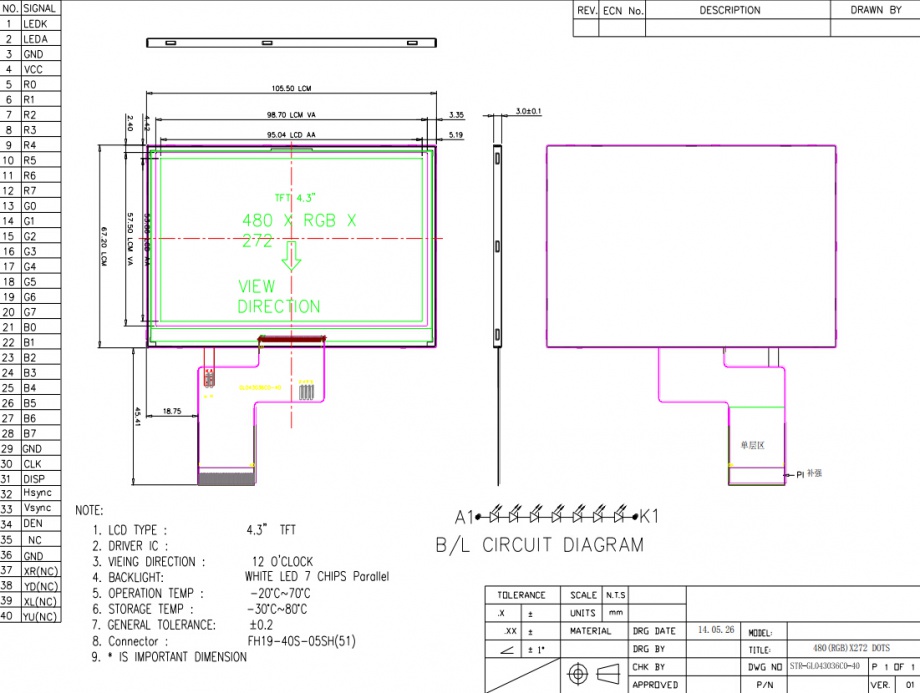 | 关键描述: | 4.3寸TFT液晶屏 180亮度 480*272分辨率 40PINS RGB接口 小尺寸液晶显示屏 手持终端 工业液晶屏 |