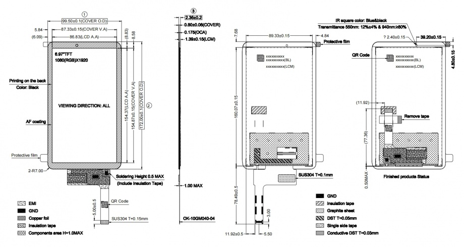 | 显示尺寸: | 86.83 (宽) × 154.37 (高) mm (A.A) |