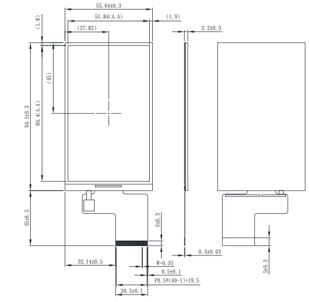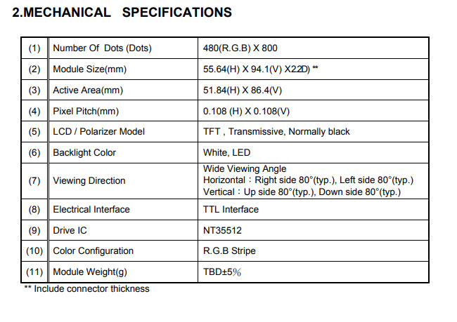 | 显示尺寸: | 51.84 (宽) × 86.4 (高) mm (A.A) |