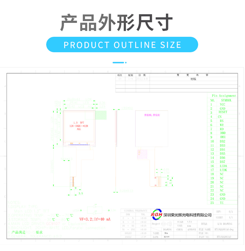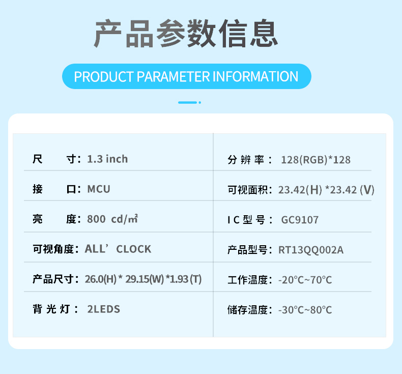 | 关键描述: | 1.3寸液晶显示屏128*128 IPS TFT 800亮度 GC9107 |