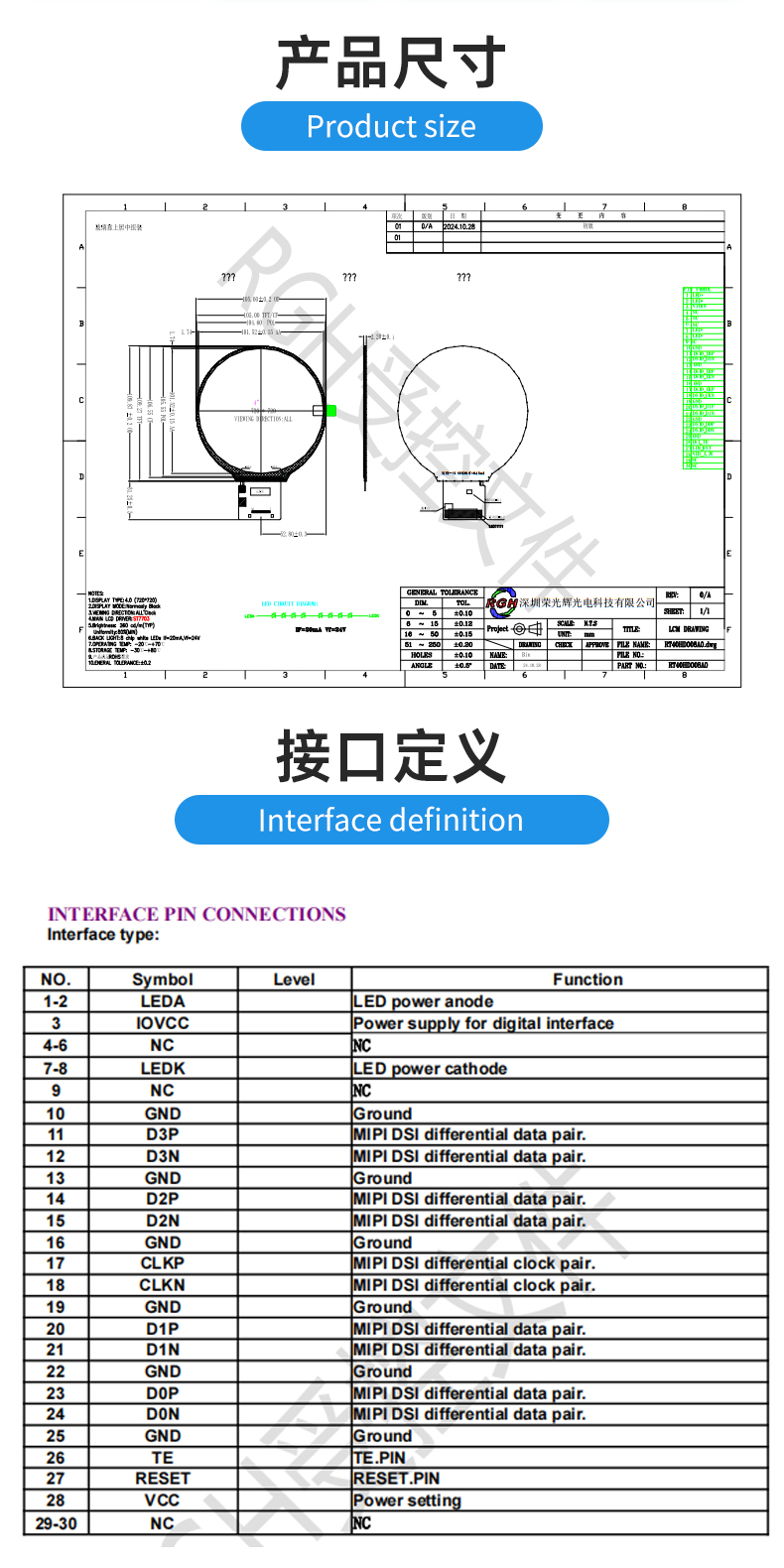 | 关键描述: | 4寸圆形屏 720*720, MIPI ST7703 全视角 30pin |