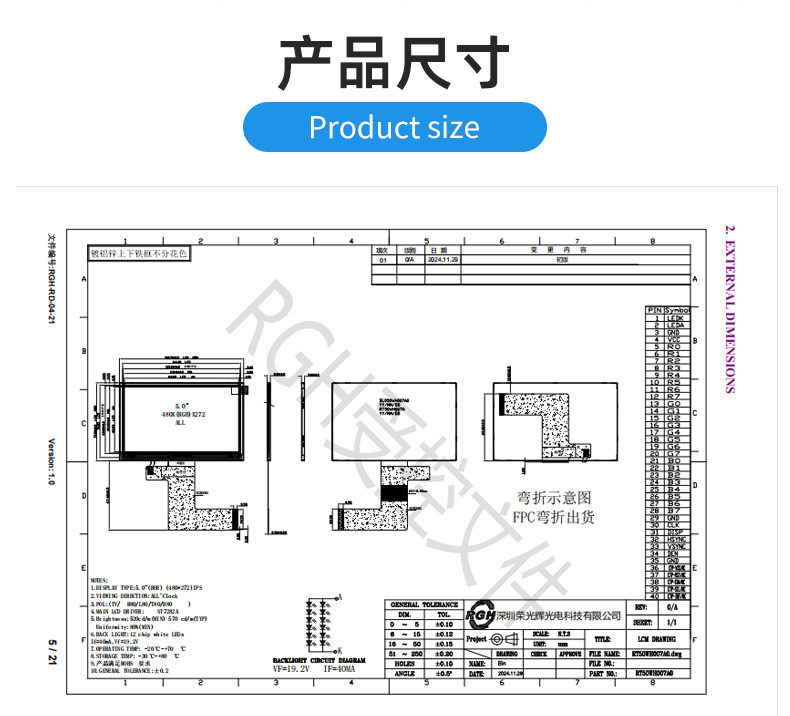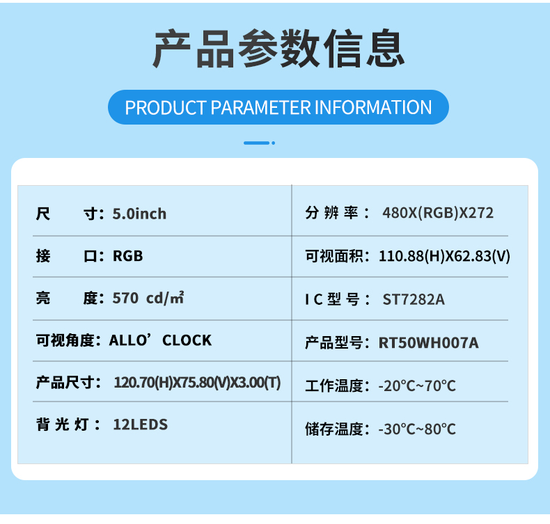 | 关键描述: | 5.0寸 TFT 液晶显示屏 480x272 分辨率 RGB接口ST7282A IC 全视角 工业级显示模组 |