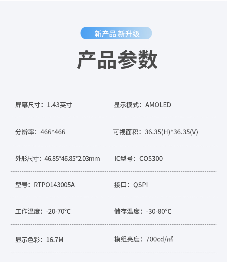 | 关键描述: | 1.43寸 AMOLED 液晶显示屏 466X466 分辨率 QSPI接口 CO5300 IC 全视角 高亮700尼特 |