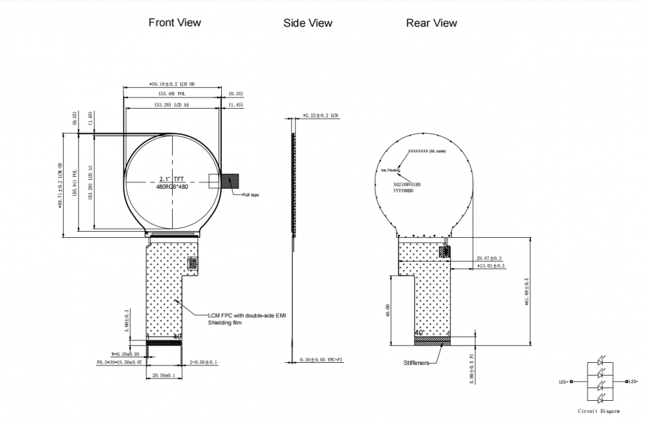 2.1寸480*480, 500nits, 40pins16bit RGB接口, TFT LCM 液晶模组 , 圆屏
