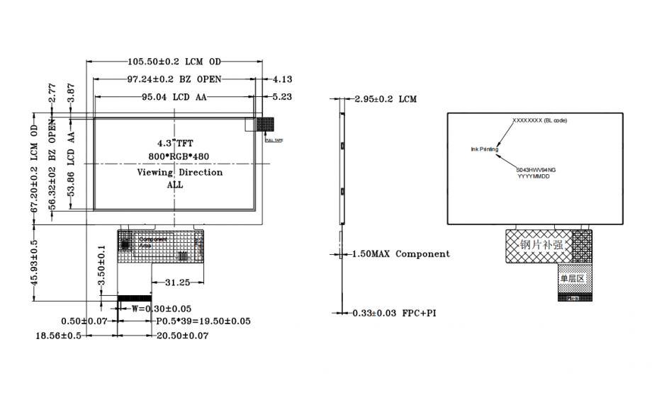 4.3寸, 800*480, 350nits, 40pins, RGB接口, TFT LCM 液晶模组