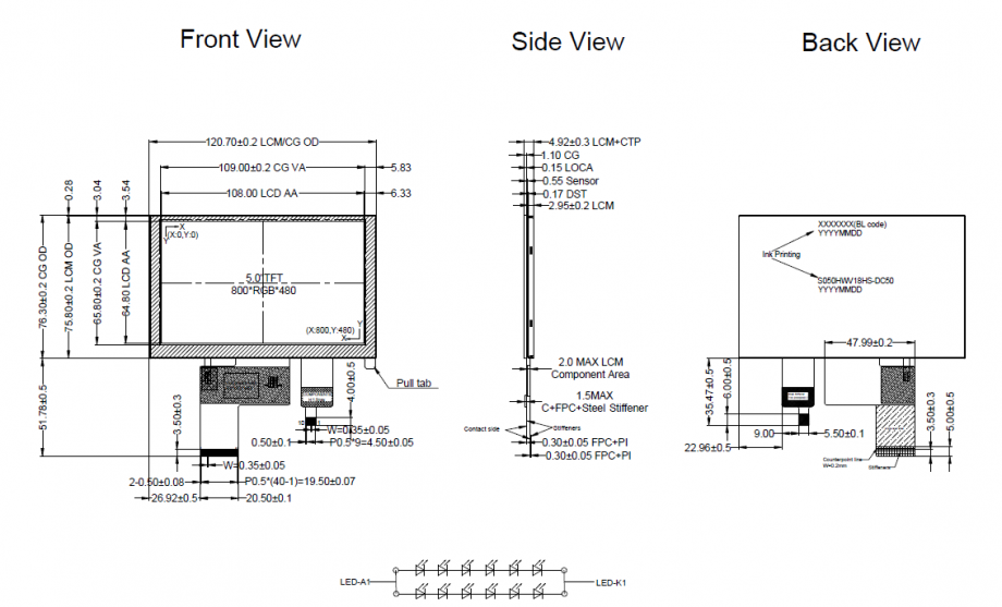 5.0寸带电容触摸屏, 800x480, 400nits, 40pins, RGB接口