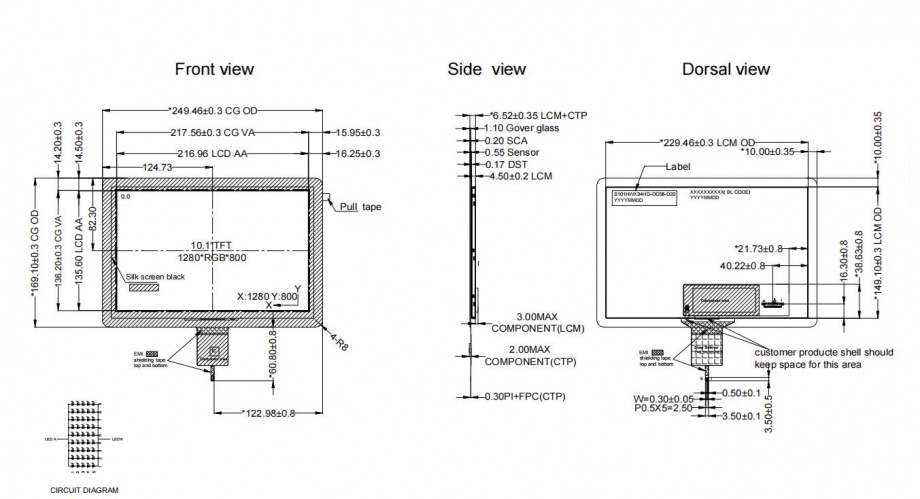 10.1寸, 1280x800 400nits 40pins LVDS接口, TFT LCD 电容触摸屏