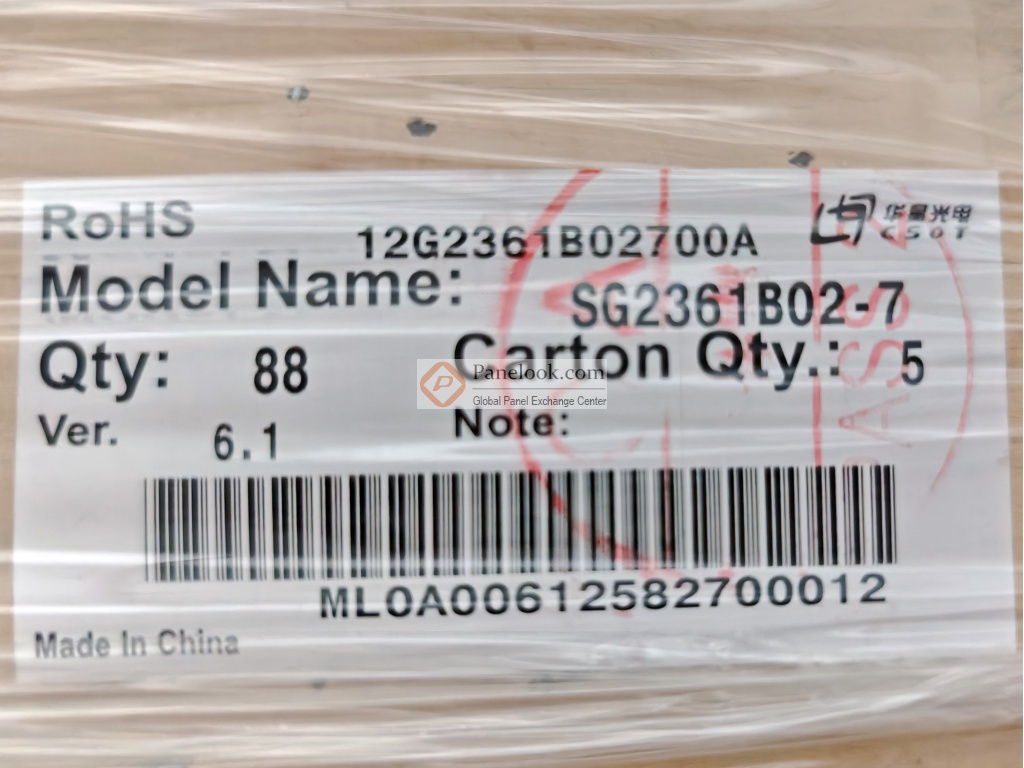 SG2361B02-7是华星光电 (CSOT)推出的一款23.6吋a-Si TFT-LCD液晶玻璃产品,它无背光,无触摸。此产品工作温度为 0 ~ 50°C,存储温度为 -20 ~ 60°C。它的典型特征屏库总结为: sRGB,165Hz,表面雾面。基于它的特征屏库推荐此型号应用于电脑显示器,游戏等产品。本产品已邦定6 source chips驱动IC。根据屏库掌握的情报此产品于2023年Q1量产,当前生产状态为量产中。目前此型号在屏库上有0条现货信息、0家供应商信息,交易氛围清淡。屏库于2025年12月10日对此型号首次建立参数。根据华星光电 (CSOT)于2022年11月25日发布的版本号为Ver6.1的产品规格书,SG2361B02-7显示分辨率为1920(RGB)×1080 (FHD),宽高比为16:9 (宽:高),像素采用RGB垂直条状排列。它的显示区域尺寸为521.395(宽)×293.285(高) mm,外观尺寸为532.995(宽)×304.185(高)×1.06(厚) mm,表面处理为雾面 (Haze 25%),产品净重420g (Typ.),采用了0.38+0.38 mm的玻璃基板。本产品无背光。SG2361B02-7采用了LVDS (4 ch, 8-bit)信号接口,总共61 pins,采用端子连接,驱屏电压为12V (Typ.)。它的典型垂直刷新率Fv为165Hz。屏库上标注的生产状态仅供参考,不应作为用户的决策依据。屏库®上所显示的面板参数均由屏库电子工程师依据规格书录入,已尽力减少错误,但不能保证参数的完全正确。请以规格书为准!如果开发新产品想采用此液晶玻璃,关于SG2361B02-7的最新的生产状态信息和技术信息,屏库®建议您咨询华星光电 (CSOT)。