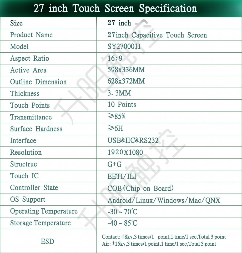 | 关键描述: | 27寸电容触摸屏 G+G 多点触摸 USB 防水电容屏 商显一体机触摸屏 医疗显示触摸屏 工业触摸屏 |