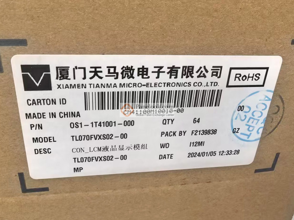 天马 (TIANMA) 推出的TL070FVXS02 (别名: TL070FVXS02-00) (产品代码: TMA2027)是一款采用a-Si TFT-LCD技术的7.0英寸屏幕总成产品,它装配有WLED背光,含LED驱动背光驱动,投射电容触摸屏。屏库总结它的典型特征为: sRGB,120Hz,带触摸屏,白光LED背光,含LED驱动器, eDP1.4b。它的工作温度为 0 ~ 50°C,存储温度为 -20 ~ 60°C。此型号适合应用于平板电脑。本产品已邦定NT56810驱动IC。根据屏库掌握的情报此产品于2024年Q1量产,当前生产状态为量产中。目前TL070FVXS02在屏库上有2条现货信息、2家供应商信息,交易氛围清淡。屏库于2025年05月15日对此型号首次建立参数,并于2026年02月09日对参数进行了最后更新。根据天马 (TIANMA)于2023年11月27日发布的版本号为Final Ver.F1.3的产品规格书,TL070FVXS02显示分辨率为1920(RGB)×1080 (FHD),宽高比为16:9 (宽:高),像素采用RGB垂直条状排列,屏库计算出的像素密度为314 PPI。它的显示区域尺寸为154.944×87.156 (宽×高) mm,外观尺寸为165.04(宽)×106.26(高)×3.49(厚) mm,表面处理为Hard coating,产品净重65.0g (Typ.)。背光方面此产品采用了8S5P WLED发光的侧入式光源,含LED驱动。TL070FVXS02采用了eDP (2 Lanes)信号接口,总共40 pins,采用端子连接,驱屏电压为3.3V (Typ.)。它的典型垂直刷新率Fv为120Hz。如果开发新产品想采用TL070FVXS02屏幕总成,屏库®建议您向天马 (TIANMA)或其代理商了解关于TL070FVXS02的最新的生产状态信息和技术信息。屏库®上所显示的面板参数均由屏库电子工程师依据规格书录入,已尽力减少错误,但不能保证参数的完全正确。请以规格书为准!