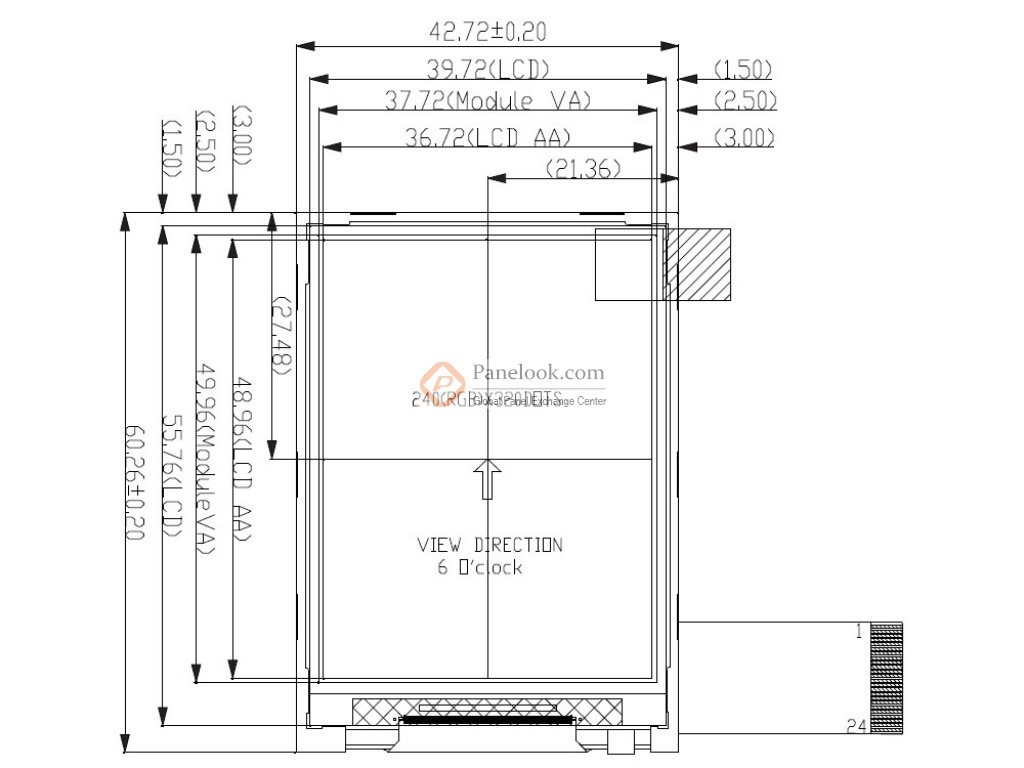 TM024HDH49-01是天马 (TIANMA)推出的一款2.4吋a-Si TFT-LCD液晶模组产品,它装配有WLED背光,无背光驱动,无触摸。此产品工作温度为 -20 ~ 70°C,存储温度为 -30 ~ 80°C。它的典型特征屏库总结为: 肖像模式,白光LED背光。基于它的特征屏库推荐此型号应用于手机,手持终端等产品。本产品已邦定HX8347-G驱动IC。根据屏库掌握的情报此产品于2011年Q3量产,当前生产状态为量产中。目前此型号在屏库上有1条现货信息、3家供应商信息,交易氛围清淡。屏库于2023年12月01日对此型号首次建立参数,并于2024年11月22日对参数进行了最后更新。根据天马 (TIANMA)于2015年12月8日发布的版本号为Final Ver2.9的产品规格书,TM024HDH49-01显示分辨率为240(RGB)×320 (QVGA),宽高比为3:4 (宽:高),像素采用RGB垂直条状排列。它的显示区域尺寸为36.72(宽)×48.96(高) mm,外观尺寸为42.72(宽)×60.26(高)×2.45(厚) mm,表面处理为Clear,产品净重12.0g (Typ.)。背光方面此产品采用了1S4P WLED发光的侧入式光源,光源的使用寿命为20K小时,不含背光驱动。TM024HDH49-01采用了8/9/16/18-bit 8080 并口信号接口,总共24 pins,采用FPC连接,驱屏电压为2.8/2.8V (Typ.)(IOVCC/VCC)。它的典型垂直刷新率Fv为60Hz。屏库上标注的生产状态仅供参考,不应作为用户的决策依据。屏库®上所显示的面板参数均由屏库电子工程师依据规格书录入,已尽力减少错误,但不能保证参数的完全正确。请以规格书为准!如果开发新产品想采用此液晶模组,关于TM024HDH49-01的最新的生产状态信息和技术信息,屏库®建议您咨询天马 (TIANMA)。