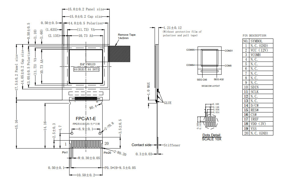 0.6寸彩色PMOLED 64x64 200cd/m2 完全兼容UG-6464TDDBG01 可用于医疗及小型手持设备 |