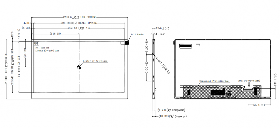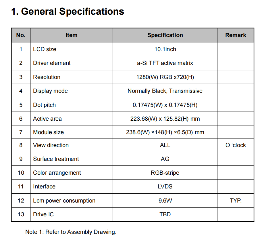 10.1寸1280*720 LVDS接口 40pin 高亮1100cd/m² 全视角液晶显示屏 |