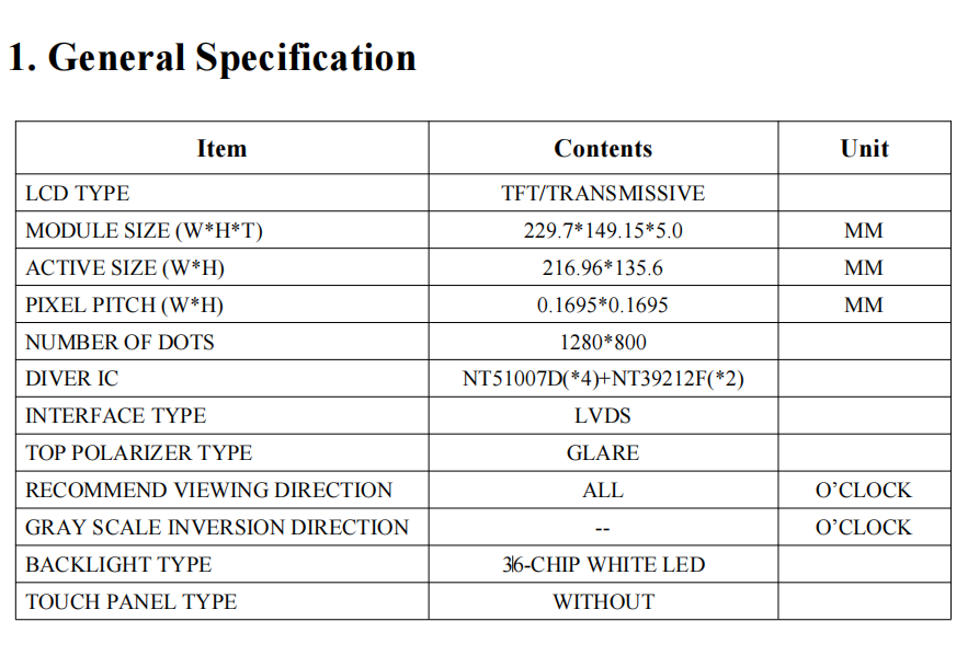 10.1寸 1280x800 LVDS 亮度1000 45pin 全视角不带触摸 液晶显示屏 |
