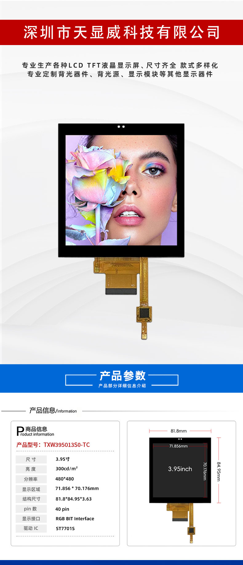 | 关键描述: | 3.95寸480*480方形屏 IPS高清高亮全视角显示屏86智能开关医疗显示家电液晶显示屏 |