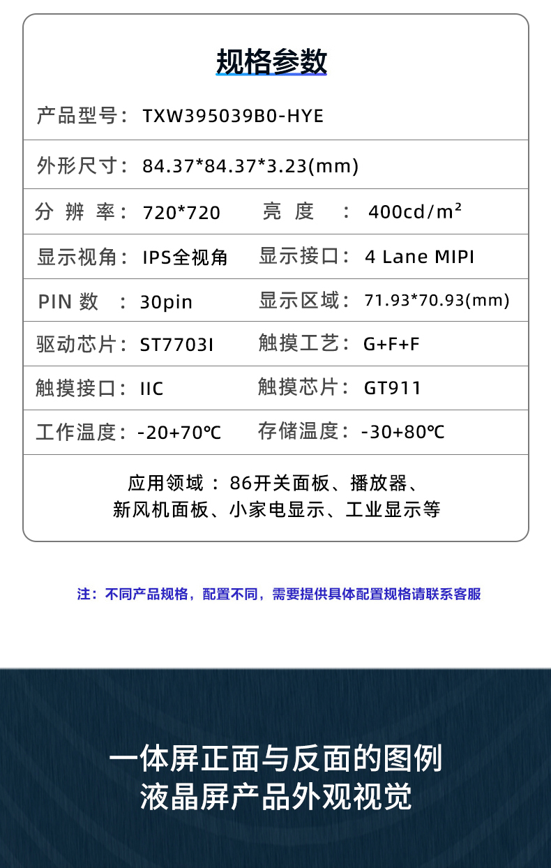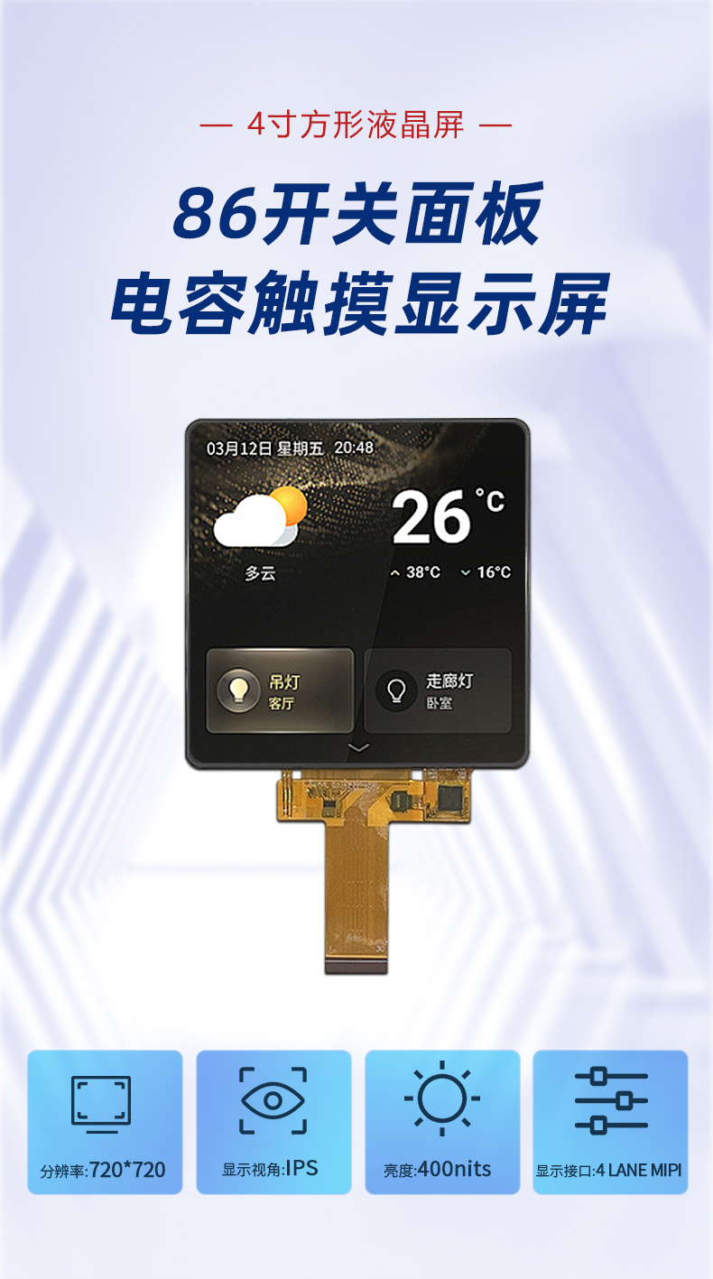 | 关键描述: | 4寸方形720*720触摸屏LCD模组MIPI亮度400播放器显示86开关面板 |