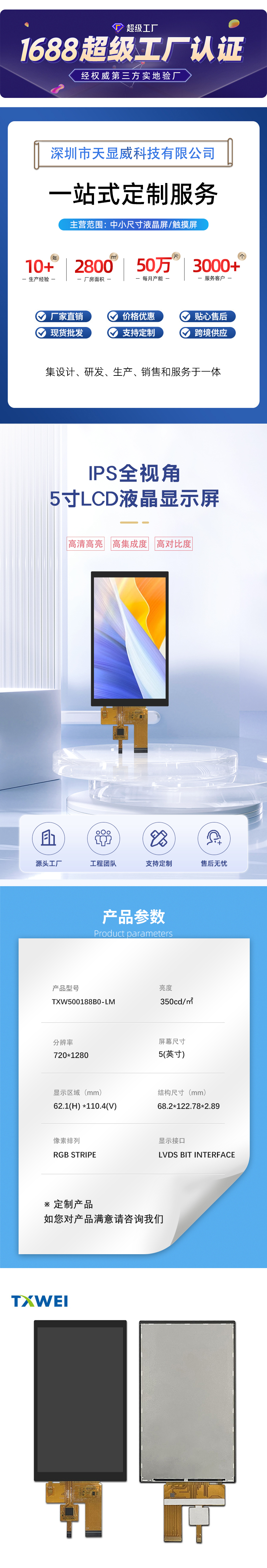 | 关键描述: | 5.0寸720*1280 IPS触摸液晶显示屏支付设备显示屏 监视设备显示显示屏 门禁考勤设备显示屏 安防设备 手持设备显示屏 |