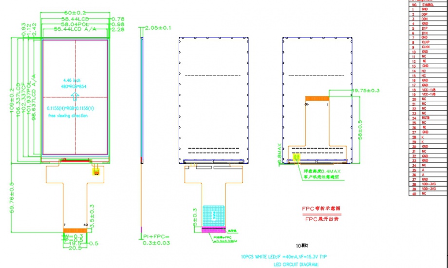 | 关键描述: | 4.5寸480*854 330亮度 MIPI接口 40PIN 手持设备用屏 |
