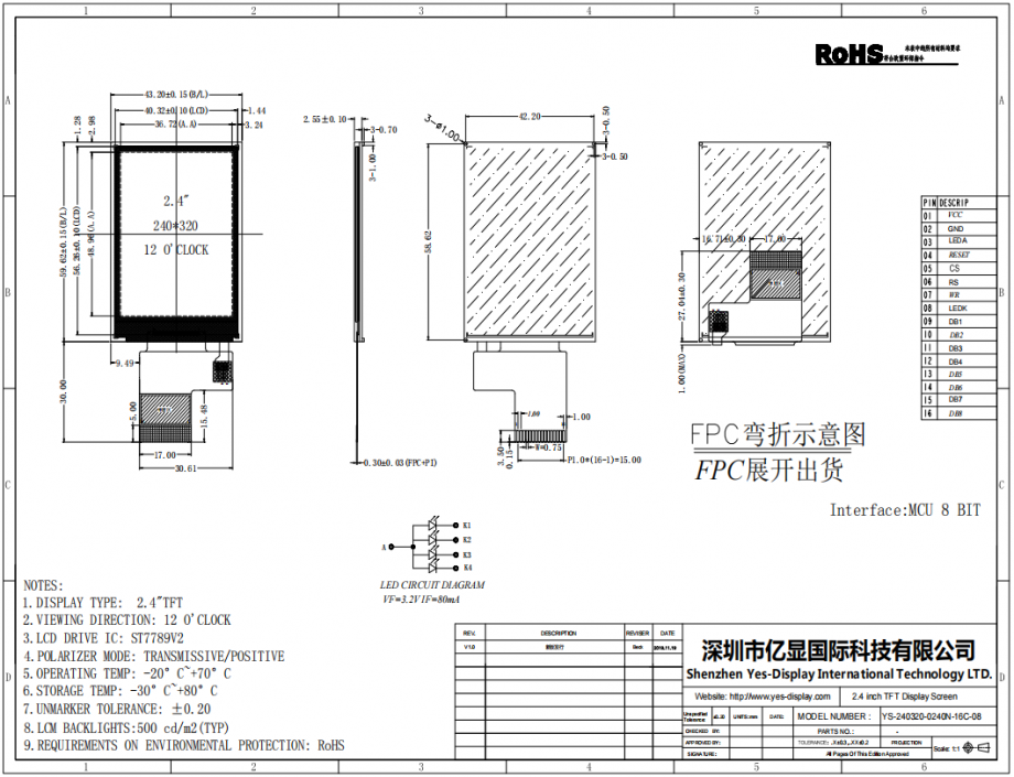 | 关键描述: | 亿显国际2.4寸240*320 500亮度 TN液晶显示屏16PIN MCU8 ST7789V2 可配触摸(工业、家电、玩具、医疗类用TFT液晶显示屏) |