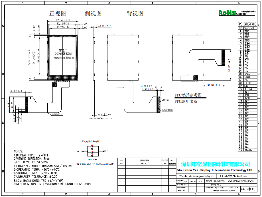 | 关键描述: | 亿显国际, 2.4寸 240*320 150亮度, 40PIN, MCU, ST7789V 可配触摸(工业、家电、玩具、医疗类用TFT液晶显示屏) |