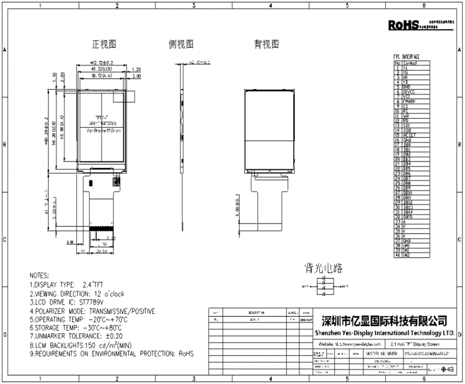 | 关键描述: | 亿显国际2.4寸240*320 150亮度, 40PIN MCU, ST7789V 可配触摸(工业、家电、玩具、医疗类用TFT液晶显示屏) |