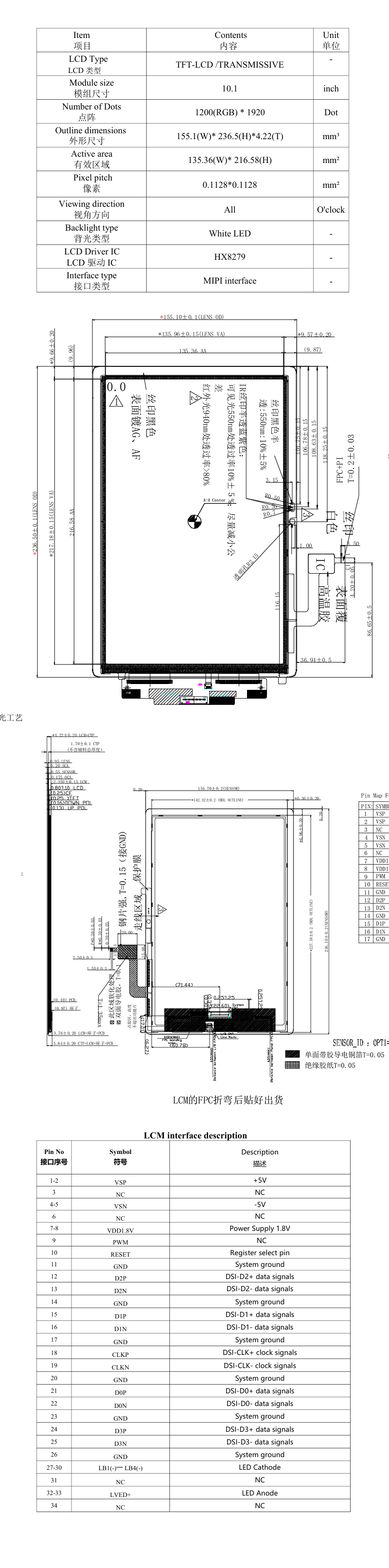 | 关键描述: | 10.1寸1200*1920竖屏MIPI34pin 电容触摸平板屏 LCM彩屏车载屏 |