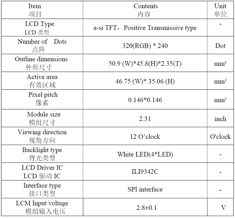 | 关键描述: | 宇锡2.31寸横屏液晶显示模组, 320x 240, 220亮度, 18pins, SPI接口, ILI9342C, 横屏12点钟视角LCD显示屏 |